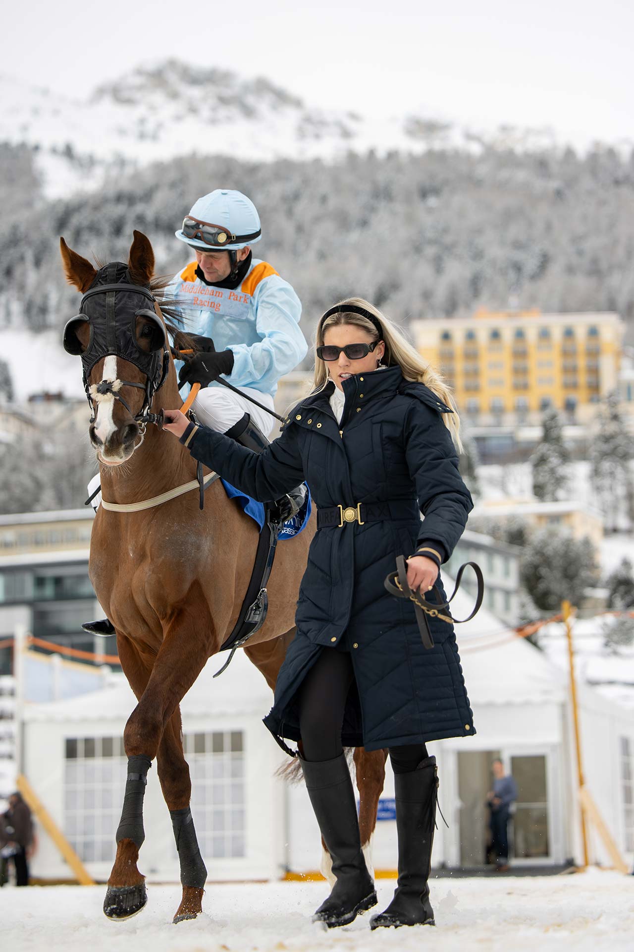 Wir bereiten unsere Pferde gezielt auf diese Bedingungen vor – etwa durch spezielle Hufeisen mit Spikes und gezieltes Krafttraining. Gleichzeitig bleibt immer ein gewisser Respekt vor der Natur: Wind, Temperatur und Sonnenlicht können alles beeinflussen. Genau das macht den White Turf so faszinierend – hier zählen Erfahrung, Instinkt und Teamgeist.